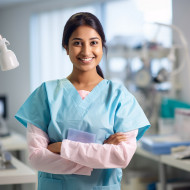 infection control specialist woman indian healthcare worker doctor nurse lab technician scientist research medicine patient care treatment prevention safety hygiene cleanliness blurred background friendly smiling beautiful indian woman medical professional healthcare hospital clinic laboratoryImagine Buddy