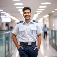 indian man hospital security personnel work friendly smiling handsome blurred background job uniform happy kind helpful professional trustworthy safe secure patient care visitor staff employee team department hospital worker help assistance protectionImagine Buddy