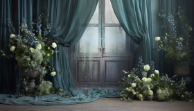 A backdrop with blue curtains and flowers, free ai prompts and images floral photo backdrops