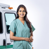 friendly smiling beautiful indian woman paramedic work isolated white background medical healthcare first responder emergency help uniform stethoscope bandage aid bag wheelchair stretcher oxygen tank ambulance hospital life save care compassion duty dedication profession vocation serviceImagine Buddy