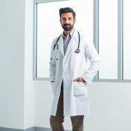 Confident handsome indian man medical assistant at work on blured background