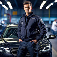 Confident handsome man automotive security personnel at work on blured background
