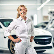 automotive valet woman friendly smiling beautiful work blurred background happy female employee staff service customer assistance parking luxury car vehicle transportation business lifestyle people portrait job career professional occupation uniform vest hat nametag smiling womanImagine Buddy