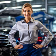 Confident beautiful woman automotive service manager at work on blured background