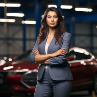 Confident beautiful indian woman automotive marketing manager at work on blured background