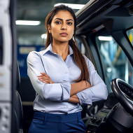 Confident beautiful indian woman automotive driver at work on blured background
