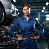 indian woman automotive service technician confident beautiful work blurred background car mechanic female engineer tools engine oil grease repair fix diagnose problem solution professional skilled experienced dedicated passionate career womanpower rolemodel inspirationImagine Buddy
