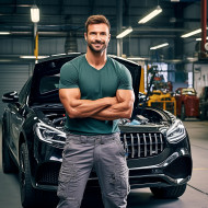 confident handsome man automotive valet work blurred background car wash clean detail shine polish wax vacuum interior exterior tires wheels engine oil gas maintenance repair service auto vehicle transportation lifestyle business professional uniform job smile friendly happy satisfied customer clientImagine Buddy