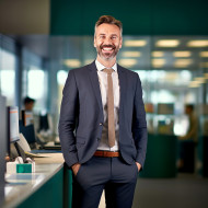 banking finance wealth advisor work friendly smiling handsome man professional business suit tie office desk computer laptop tablet phone paperwork charts graphs documents money investments savings retirement planning advice help success trust confidence securityImagine Buddy