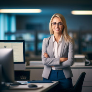 banking finance work blurred background business professional leadership success happy smile friendly beautiful female executive manager career office desk computer laptop phone finance accounting investment financial money investmentImagine Buddy