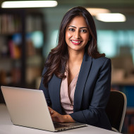 Friendly smiling beautiful indian woman banking and finance chief risk officer at work on blured background