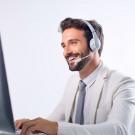 Friendly smiling handsome man banking and finance call center representative at work on blured background