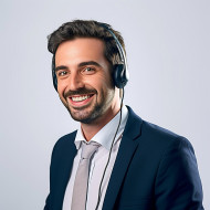 Friendly smiling handsome man banking and finance call center representative at work on blured background