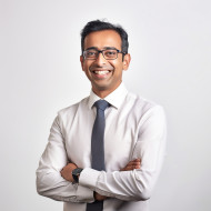 Friendly smiling handsome indian man banking and finance hr manager at work on blured background