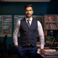 Confident handsome indian man banking and finance administrative assistant at work on blured background