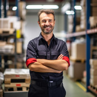 industrial models employee work blurred background friendly smiling handsome man industry job production manufacturing machinery equipment assembly line conveyor product plant warehouse worker uniform safety glasses hard hat happy positive skilled blue collar laborer team teamwork productivity efficiency success teamwork morale motivation inspiration leadership management growth development career career path career goals employment workforceImagine Buddy