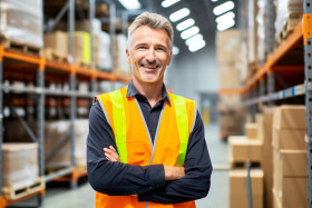 Smiling factory worker at work on blured background