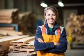 Smiling female machinist at work in factory on blured background