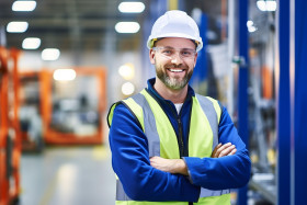 Automation engineer smiling at work on blurred background
