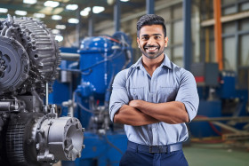 industrial models indian man mechanical engineer work blurred background handsome smiling friendly industry technology professional machine tool equipment factory factory worker manufacturing production job career happy successful motivated ambition drive dedication hardworking expertise knowledge skill experience training education intelligence problem solver creative innovativeImagine Buddy