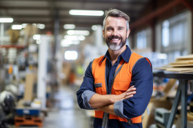 Smiling construction worker on blurred background