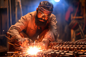 industrial models confident indian man welder work blurred background welding mask helmet sparks metal hot flame torch beads molten steel iron blue orange yellow white sparks splash goggles safety gloves workwear uniform overalls industrial factory workshop construction fabrication manufacturing india ethnicity portrait full body head and shoulders smiling happy skilled professional experienced confident strong determinedImagine Buddy
