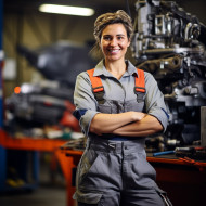 industrial models mechanic woman friendly smiling work blurred background smile happy cheerful professional skilled competent knowledgeable experienced trustworthy reliable honest affordable service repair maintenance car engine oil tires brakes wheels suspension battery alternator starter spark plugs filters belts hosesImagine Buddy