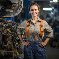 industrial models mechanic woman friendly smiling work blurred background smile happy cheerful professional skilled competent knowledgeable experienced trustworthy reliable honest affordable service repair maintenance car engine oil tires brakes wheels suspension battery alternator starter spark plugs filters belts hosesImagine Buddy