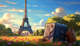 Luggage and the city of lights, adventure travel stock images, adventure travel ai prompts, travel stock images ai