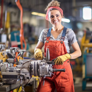 industrial models woman tool and die maker manufacturing industry work smiling friendly blurred background factory machine metal tools dies steel metalworking precision engineering skill expertise career profession trade apprenticeship education opportunity success female inspiration motivationImagine Buddy