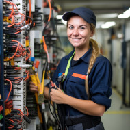 industrial models electrician woman work smile friendly blurred background electrical tools wires circuits panel box hardhat vest boots safety female power electricity job career professional skilled trade apprenticeship construction maintenance repair installation service business industry technology innovation inspiration motivation empowerment diversity inclusion rolemodel representation equity equality success achievementImagine Buddy