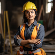 indian woman construction worker confident blurred background building site hardhat vest tools hammer nails drill safety glasses gloves boots strong powerful determined capable skilled professional female rolemodel inspiration pioneerImagine Buddy