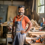 confident indian man carpenter work blur background worker wood hammer nail saw table chair shelf furniture workshop professional skilled labor industry construction home improvement repair build fix make create produce manufacture sell business trade craft art professionImagine Buddy