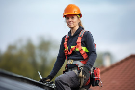 Female roofer working confidently on a blurred background