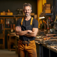 mason construction building worker confident skilled professional hard work dedication blurred background focus concentration tools equipment bricks mortar trowel blueprint safety gear hard hat vest goggles gloves boots construction siteImagine Buddy