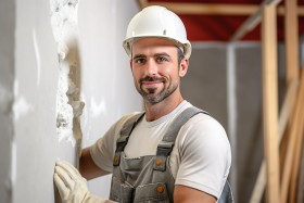 confident man drywall contractor work blurred background construction building home renovation improvement repair drywalling plasterboard gypsum wall ceiling partition interior finishing tradesman professional skilled experienced reliable qualityImagine Buddy