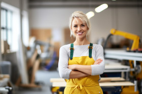 woman mason work blurred friendly smiling construction female worker building blue overalls hardhat brick tool hammer trowel level safety glasses gloves happy confident professional skilled strong independent empowered inspiring rolemodel trailblazer pioneerImagine Buddy