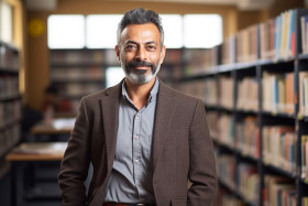 Indian male professor working on blurred background