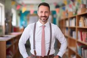 male kindergarten teacher confident work blurred background education childcare earlylearning preschool classroom students teaching learning growth development play fun activities lessons activities learning growth development play fun activities lessons activities learning growthImagine Buddy