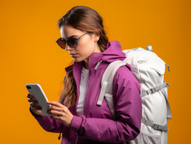 Backpacking woman checking social media, adventure travel stock images, adventure travel ai prompts, travel stock images ai
