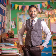 confident indian male preschool teacher work blurred background education childcare early childhood education learning development nurturing play creativity imagination fun safe supportive engaging positive inspiring role modelImagine Buddy