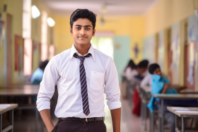 Indian high school boy studying confidently on blurred background