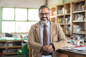 professor indian male friendly smiling work blurred background education teaching learning knowledge science research lecture classroom student mentor guidance support inspiration motivation success achievement career occupation profession job life person human indian culture diversity inclusion technology innovation futureImagine Buddy