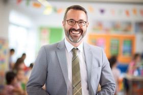 teacher male kindergarten smiling friendly work blurred background education children learning care love happy playful fun helping instructing guiding nurturing supportive caring classroom teaching students preschoolImagine Buddy
