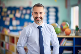 teacher male elementary school friendly smiling work blurred background education student learning teaching profession career occupation job person adult human smile face head hair eye mouth body arm hand leg foot classroom lesson lesson plan whiteboard marker chalk chalkboardImagine Buddy