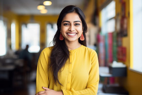 indian international student work smiling friendly woman female blur background office business education career learning growth success opportunityImagine Buddy