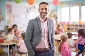 Male kindergarten teacher smiles at work blurred background