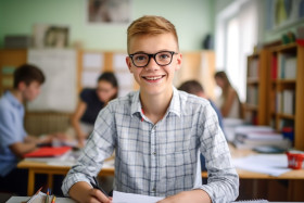 student male middle school middle school student boy smiling friendly work blurred background education learning school technology computer laptop tablet screen classroom study assignment homework project researchImagine Buddy