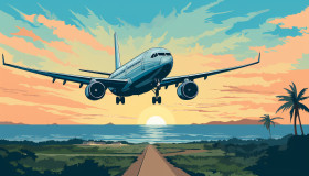Plane landing in sky blue and green, adventure travel stock images, adventure travel ai prompts, travel stock images ai
