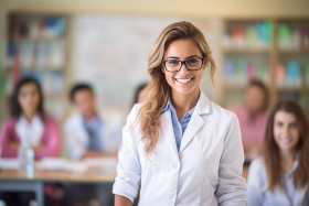 science teacher woman female smile friendly work background blurry lab classroom education school experiment learning student lecture microscope blackboard chalk whiteboard science equipmentImagine Buddy